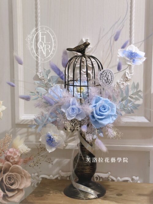 永生花鳥籠|靜謐藍調|藍玫瑰 × 紫霧花材|高雅文藝款