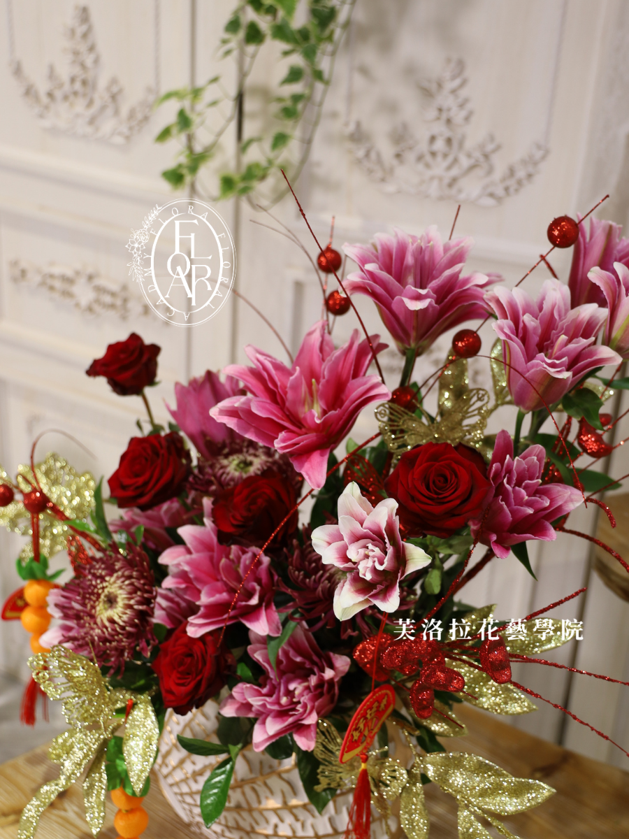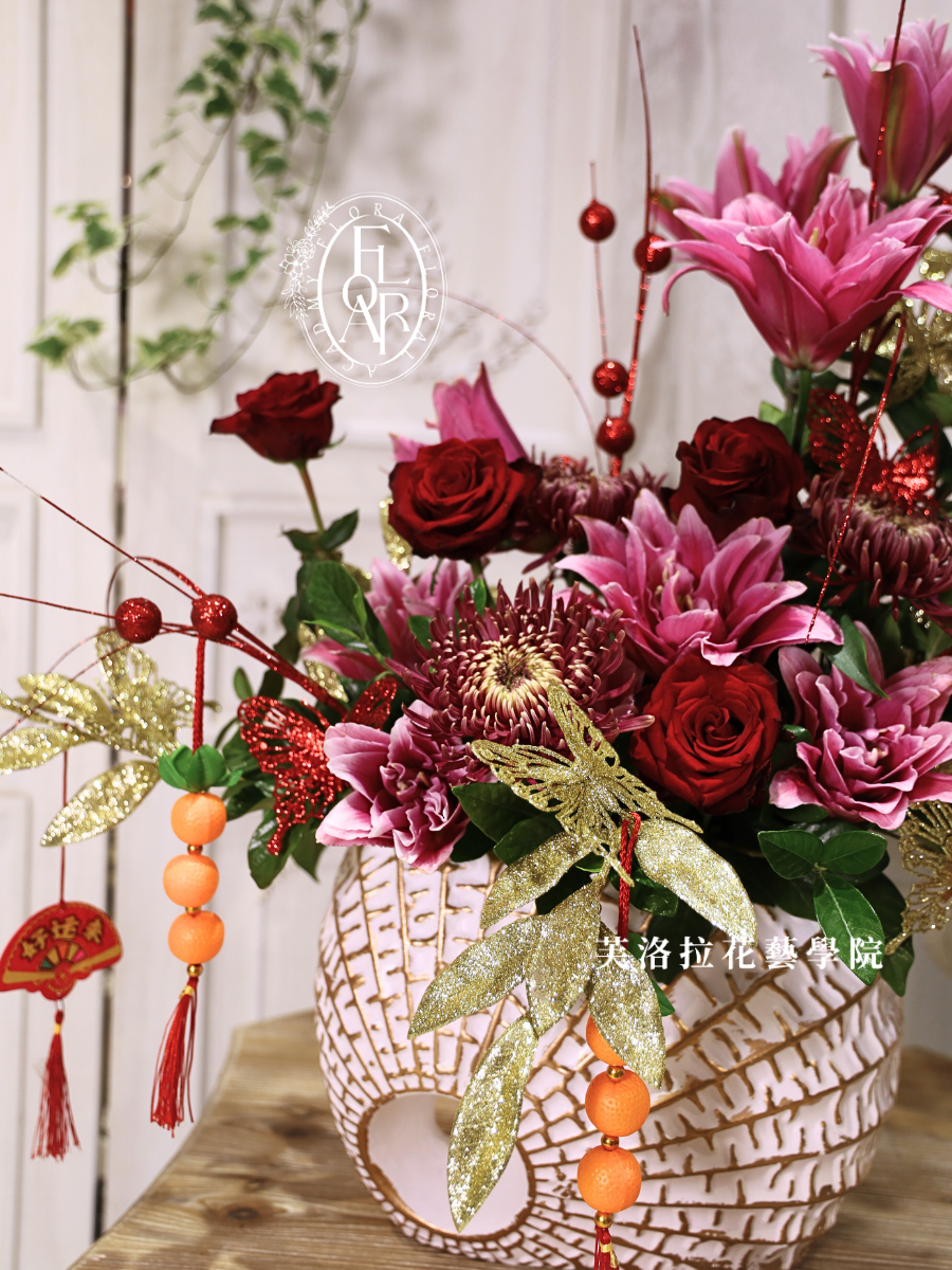 使用花材:重瓣百合、紅玫瑰、煙花菊