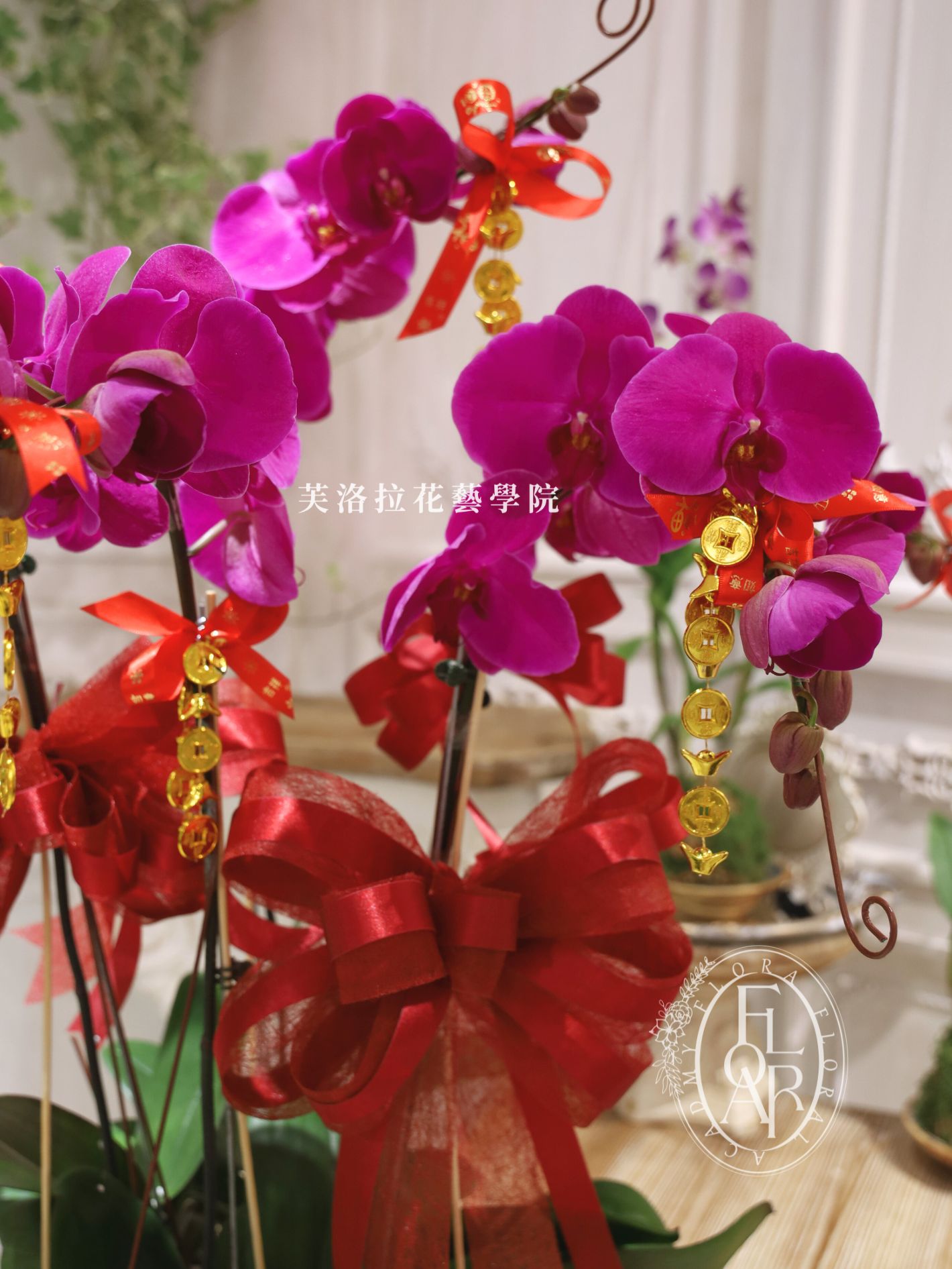 嚴選健康飽滿的蝴蝶蘭花株,搭配高質感盆器與紅色緞帶裝飾,整體展現大方典雅。喜慶金幣吊飾增添好運寓意,更襯托開運聚財的氛圍。