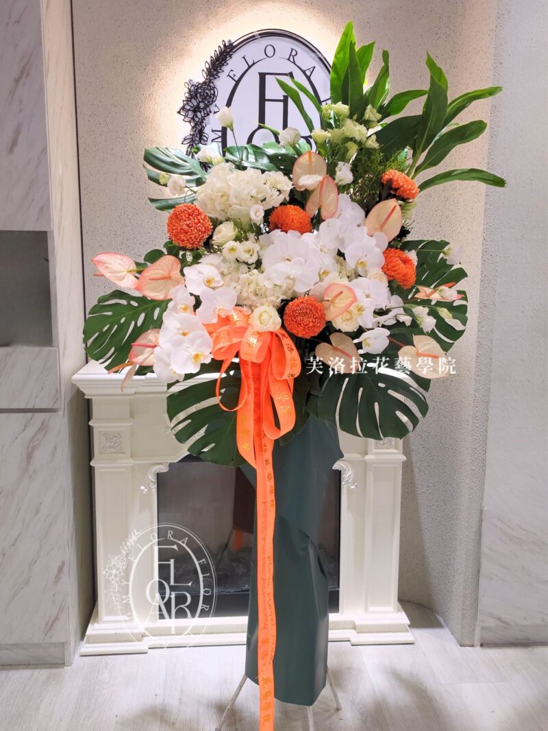 白色蝴蝶蘭象徵純潔與永恆,搭配白玫瑰的真摯思念,以及橘色花材的溫暖祝福,整體設計莊重典雅,卻不失溫柔慰藉。