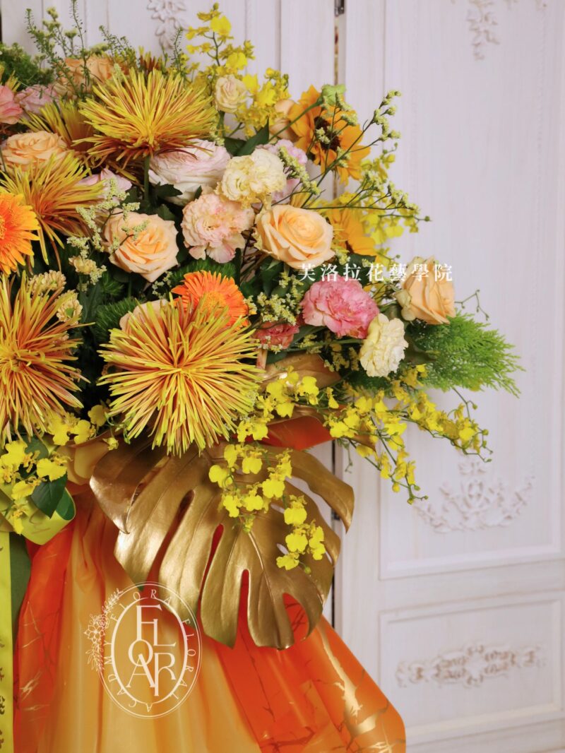 在告別與追思的場合,這份花禮不僅是對逝者的致敬,也代表著對家屬的支持與關懷。橘黃色調,像一抹夕陽般,承載著滿滿的感謝與不捨,同時也象徵生命的延續與祝福。