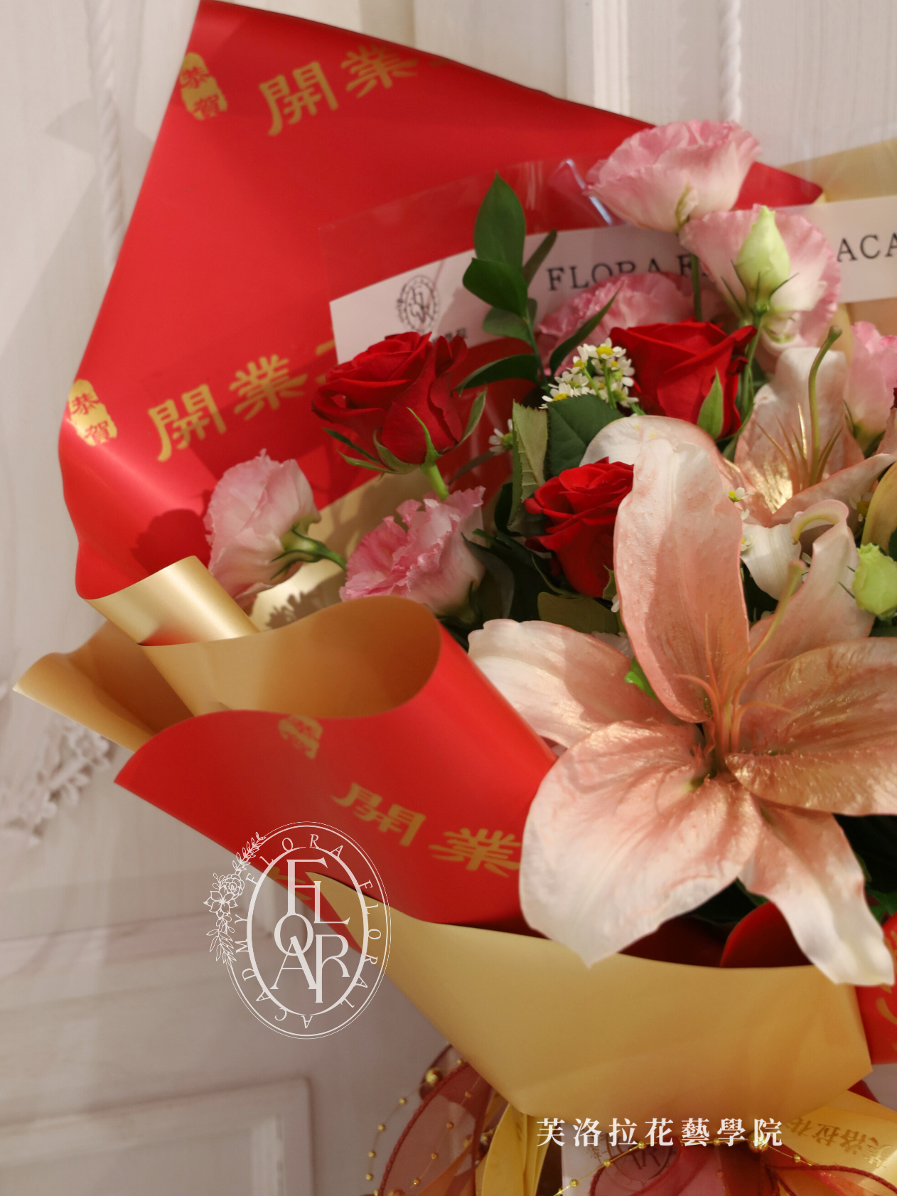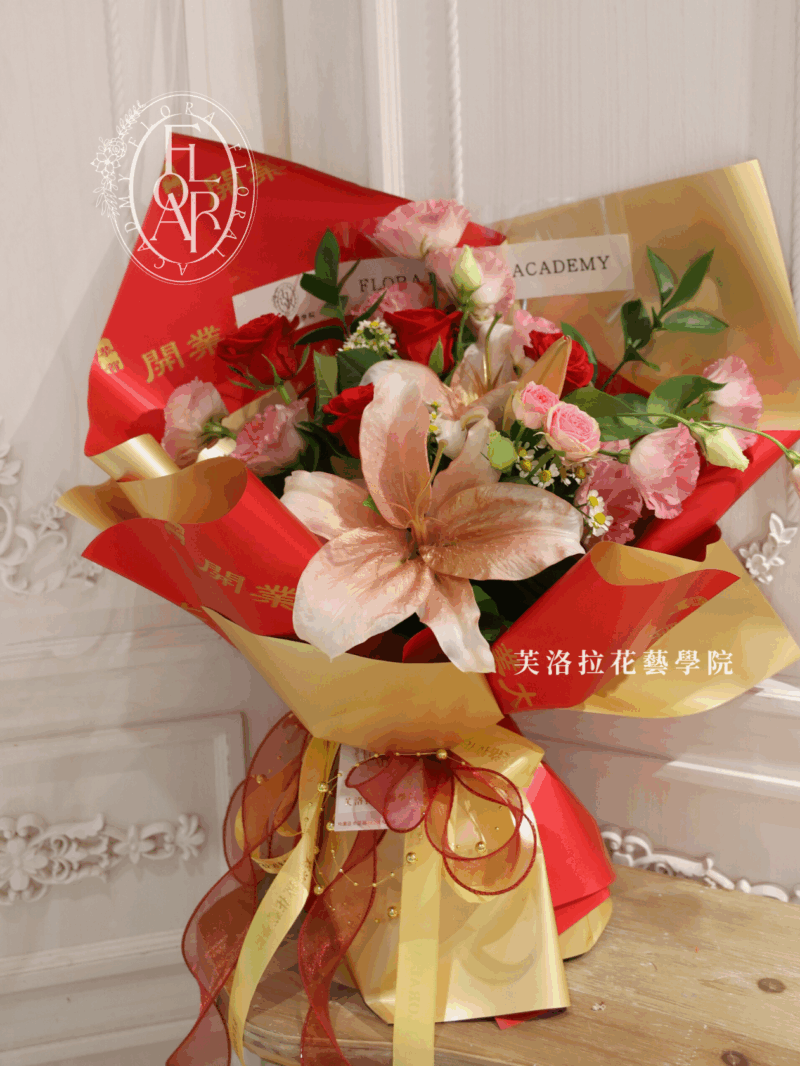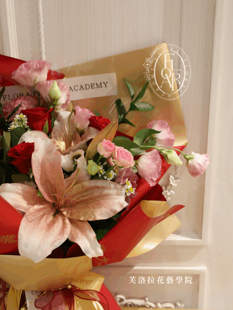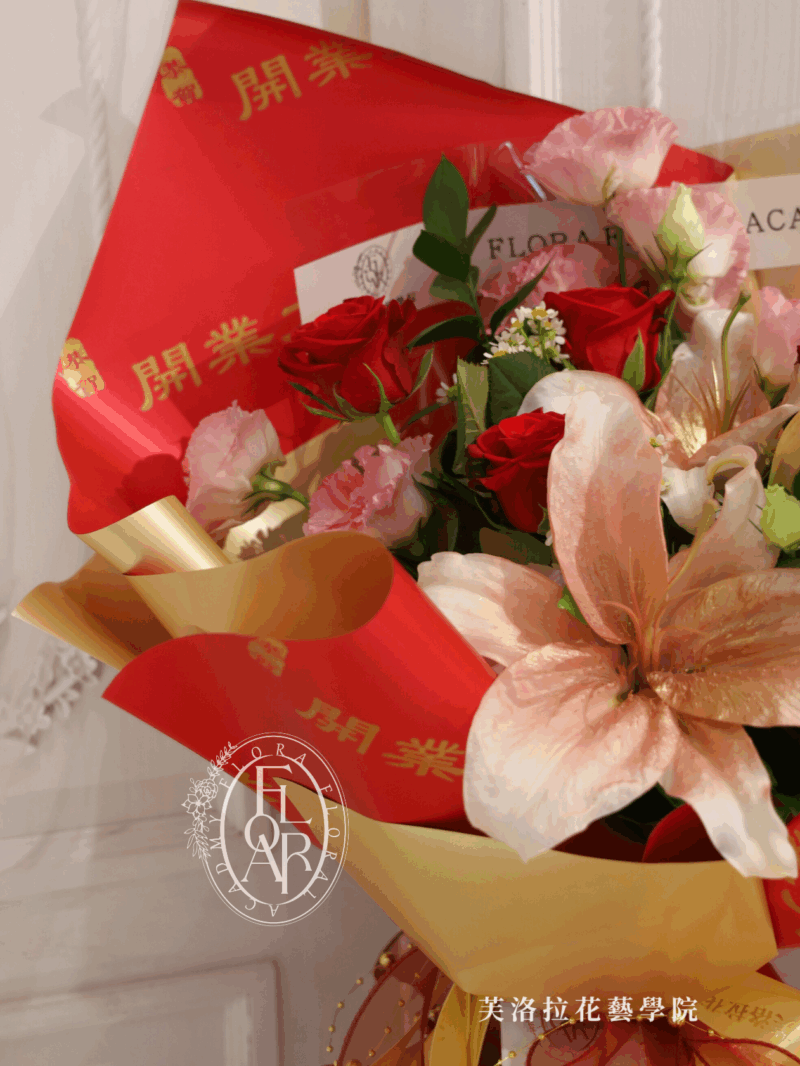以玫瑰與百合為主花,象徵吉祥與榮耀,