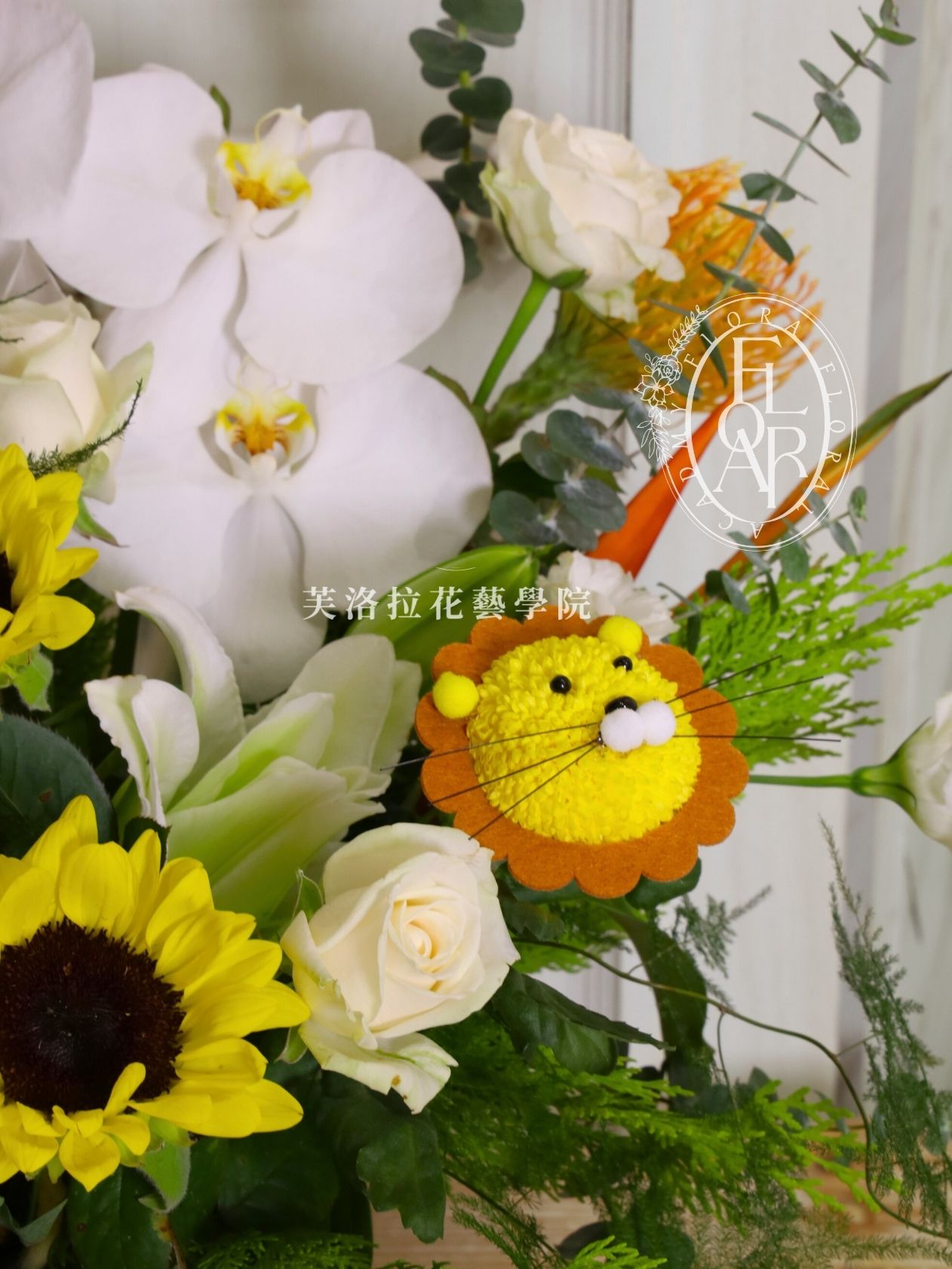 以高雅花材搭配向日葵與蝴蝶蘭,營造出時尚又充滿朝氣的氛圍,特別加入可愛的奶油獅小元素,增添活潑與溫馨感。