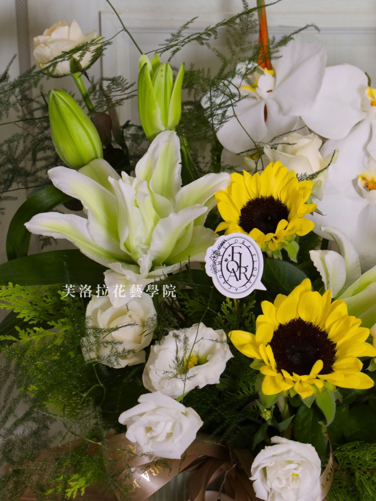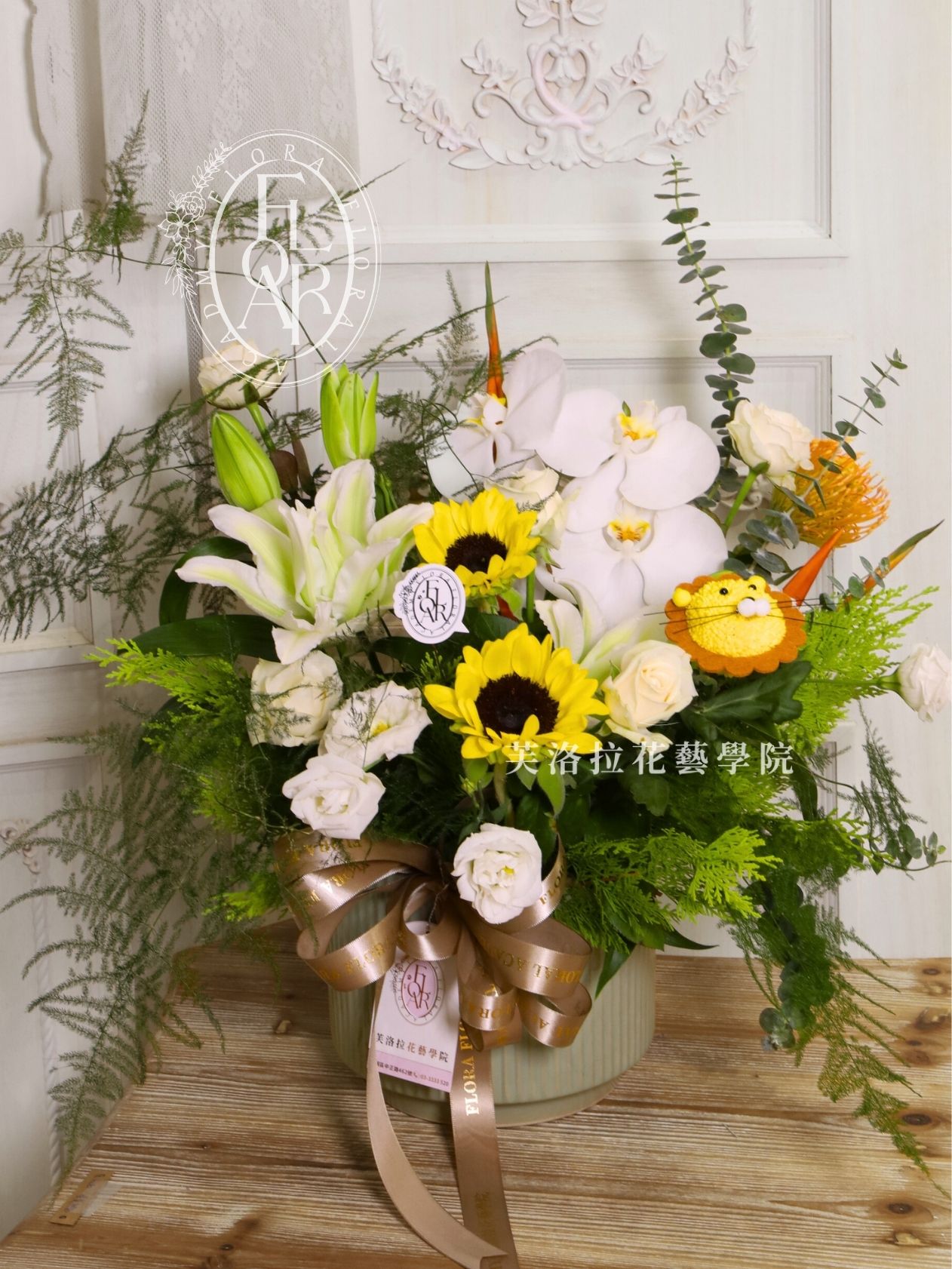 以高雅花材搭配向日葵與蝴蝶蘭,營造出時尚又充滿朝氣的氛圍,特別加入可愛的奶油獅小元素,增添活潑與溫馨感。