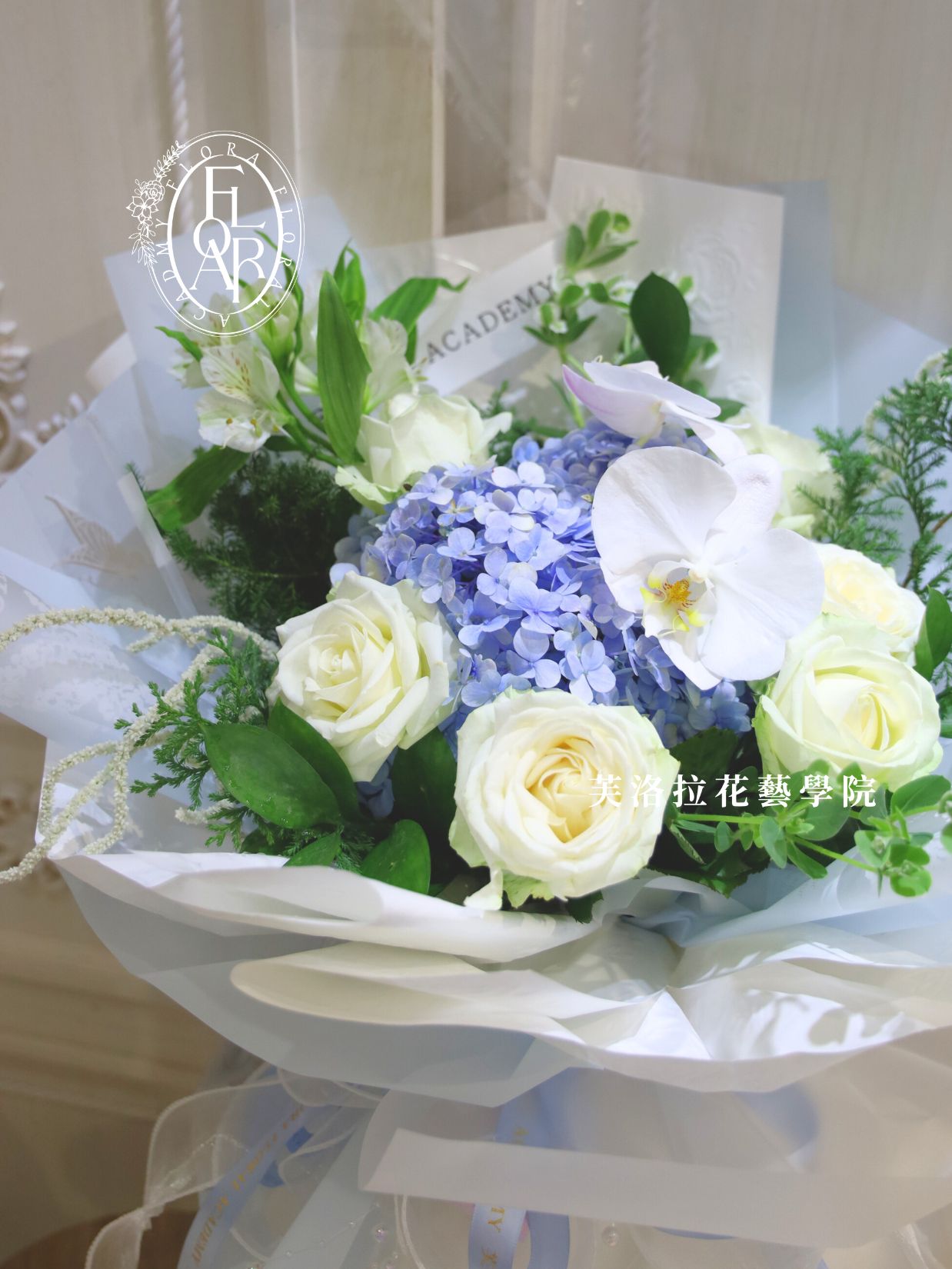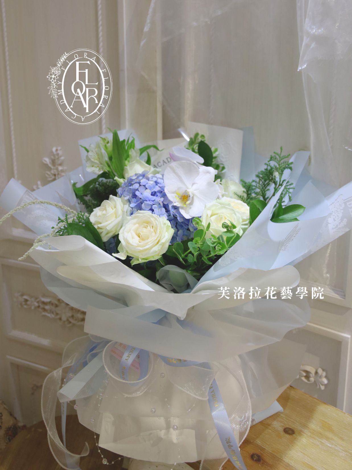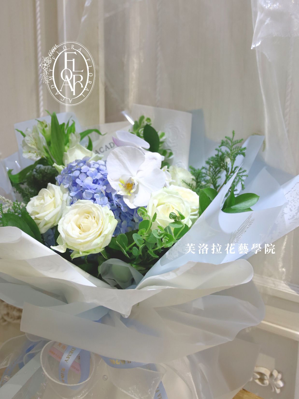 使用花材:繡球花/蝴蝶蘭/水仙百合/白玫瑰/柔麗絲/雪松/初雪草